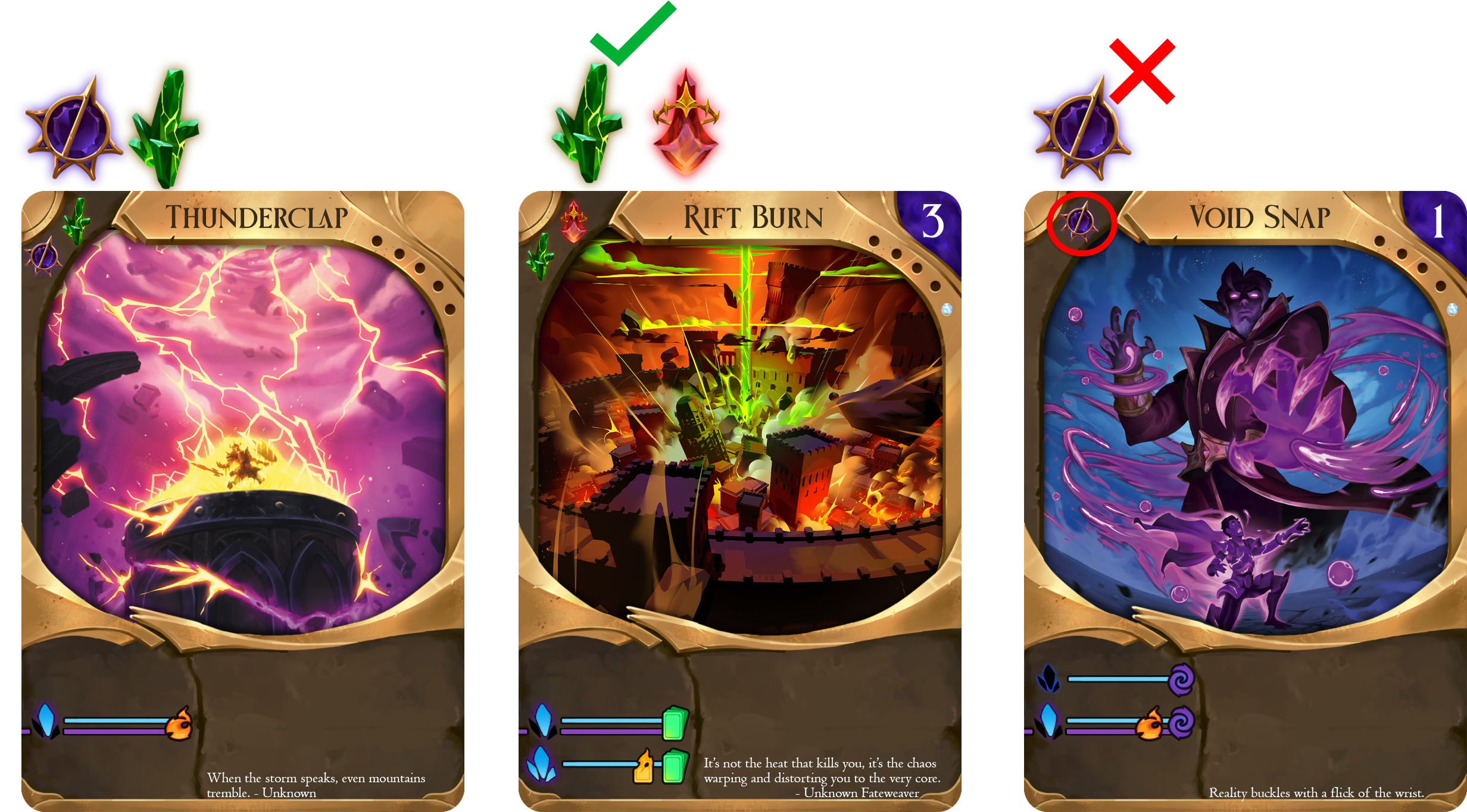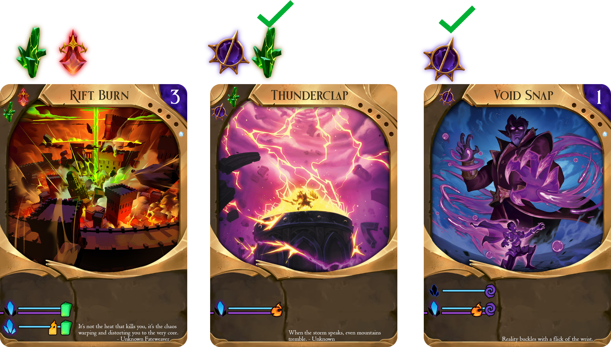 Der Aspekt „Chaos“ von „Thunderclap“ verknüpft sich mit dem Aspekt „Chaos“ von „Rift Burn“. Der Aspekt „Leere“ von „Void Snap“ passt jedoch zu keinem der beiden Aspekte von „Rift Burn“.